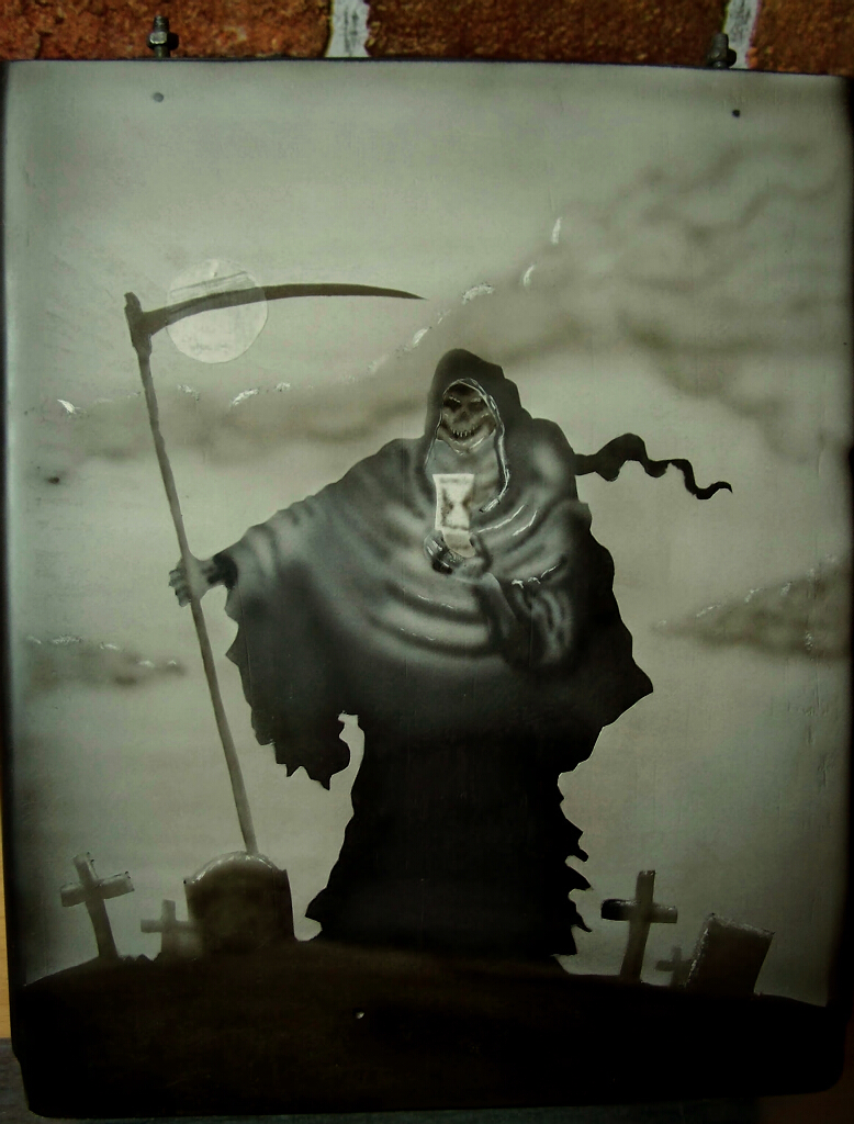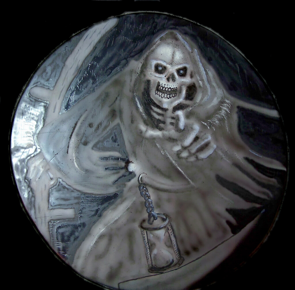 Und schließlich brauchte auch die Oberseite des Radiokastens, der etwa 160 x 300 mm groß war, ein entsprechendes Airbrush-Bild, das dem Thema entsprach. Schließlich ist der Name des Trikes „Freund Hein“. Und das Trike war natürlich dementsprechend mit einer Unmenge von Totenköpfen „dekoriert“. Der Radiokasten selbst war auch wieder aus GFK-Platten zusammengebaut, in dem der Orignaleinschub für das Radio montiert war. Für den vorderen Abschluss und ein wenig Schutz vor Regen diente eine klappbare Plexiglasscheibe.