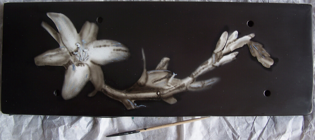 Hier die hintere Abdeckung des Radiokastens, damit man an die Stecker und Kabel konnte, ohne immer das Radio aus dem Kasten herausziehen zu müssen. Die Abdeckung war etwa 40 x 160 mm groß, gebrusht wurde eine Lilie auf einer GFK-Platte. Der Zahnstocher unter der Abdeckung, mit dem ich die Grautöne im Becher der Airbrush an gemischt hatte, verdeutlicht nochmal die Größe des Bildes.